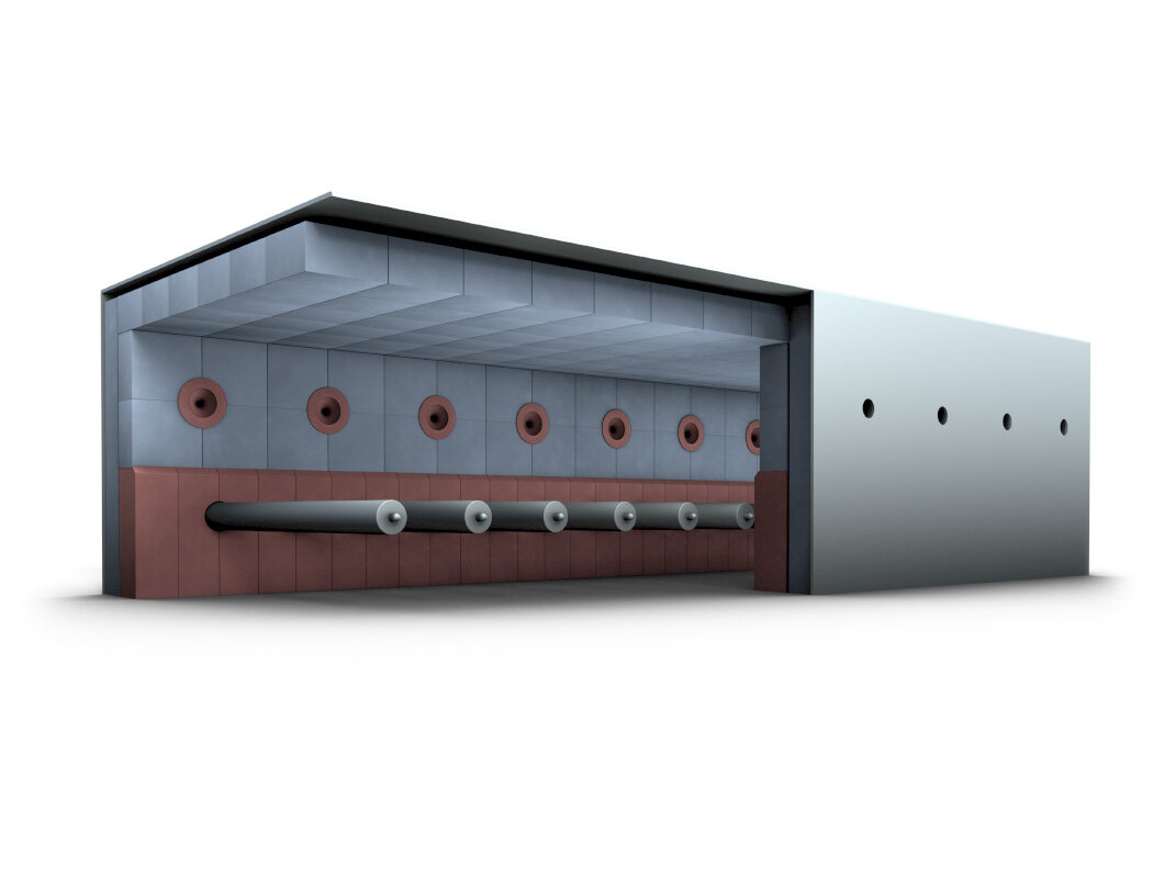 Die Kombination aus Betonformteilen und Vakuumformteilen im Rollenbereich stellen einerseits eine mechanische Beständigkeit im Ofenraum und anderseits eine perfekte Abdichtung der Rollendurchführung sicher. Für den Bereich unterhalb des Ofens verwenden wir – je nach Anforderung – trocken gepresste Steine oder Feuerleichtsteine, oberhalb des Rollenbereichs werden Produkte aus Hochtemperaturwolle eingesetzt. Diese Mischung garantiert einen optimalen Energiehaushalt.