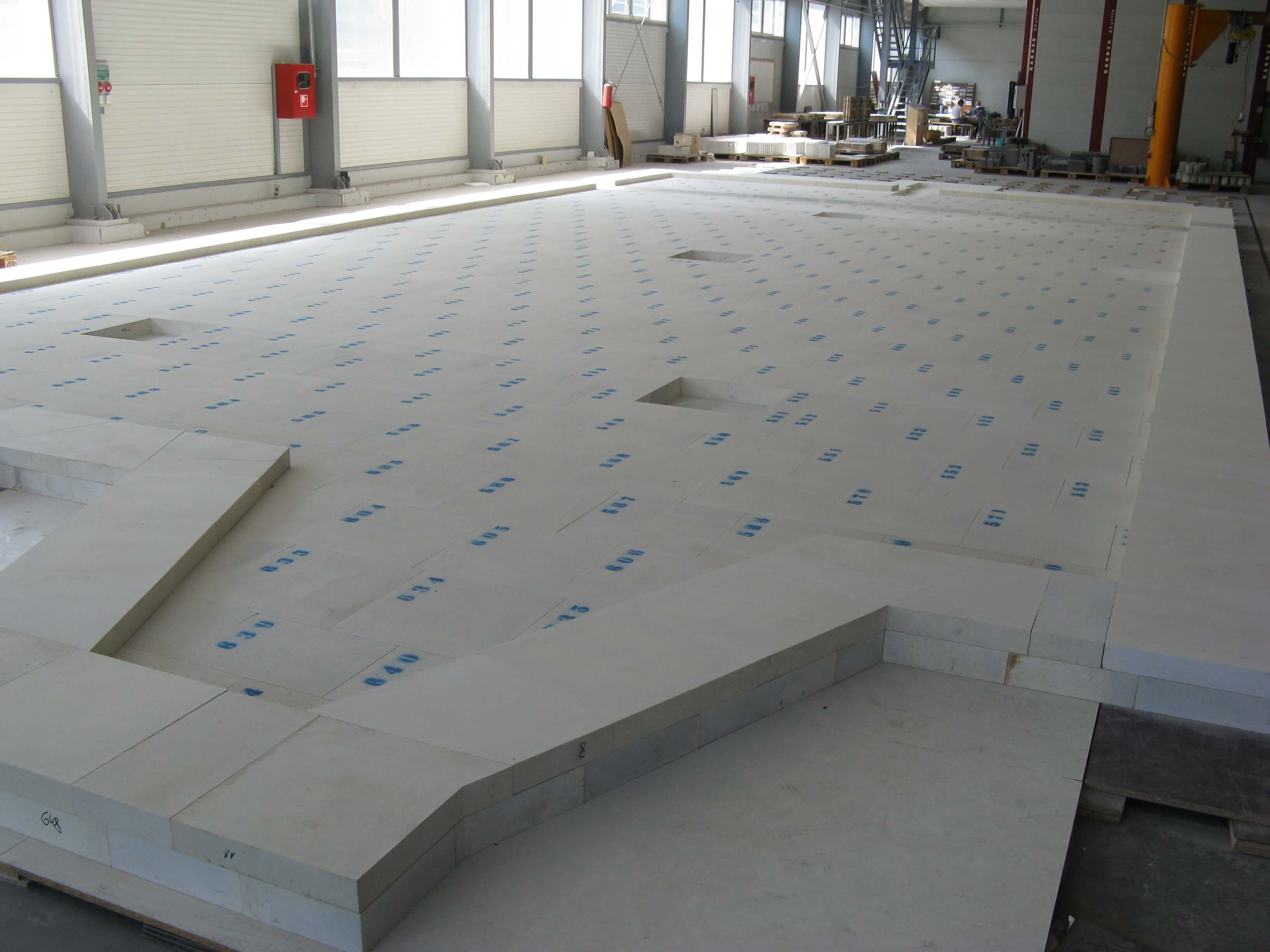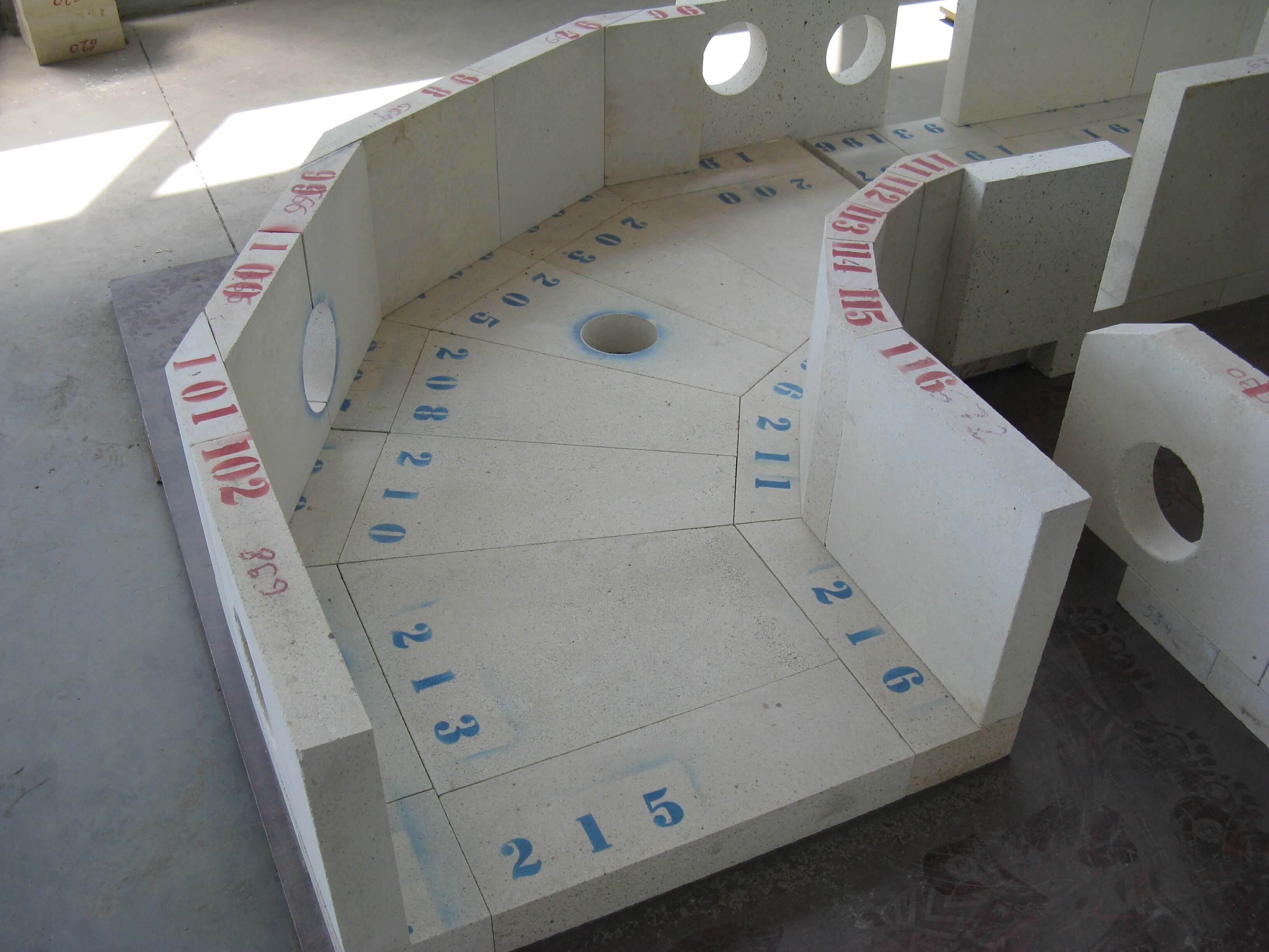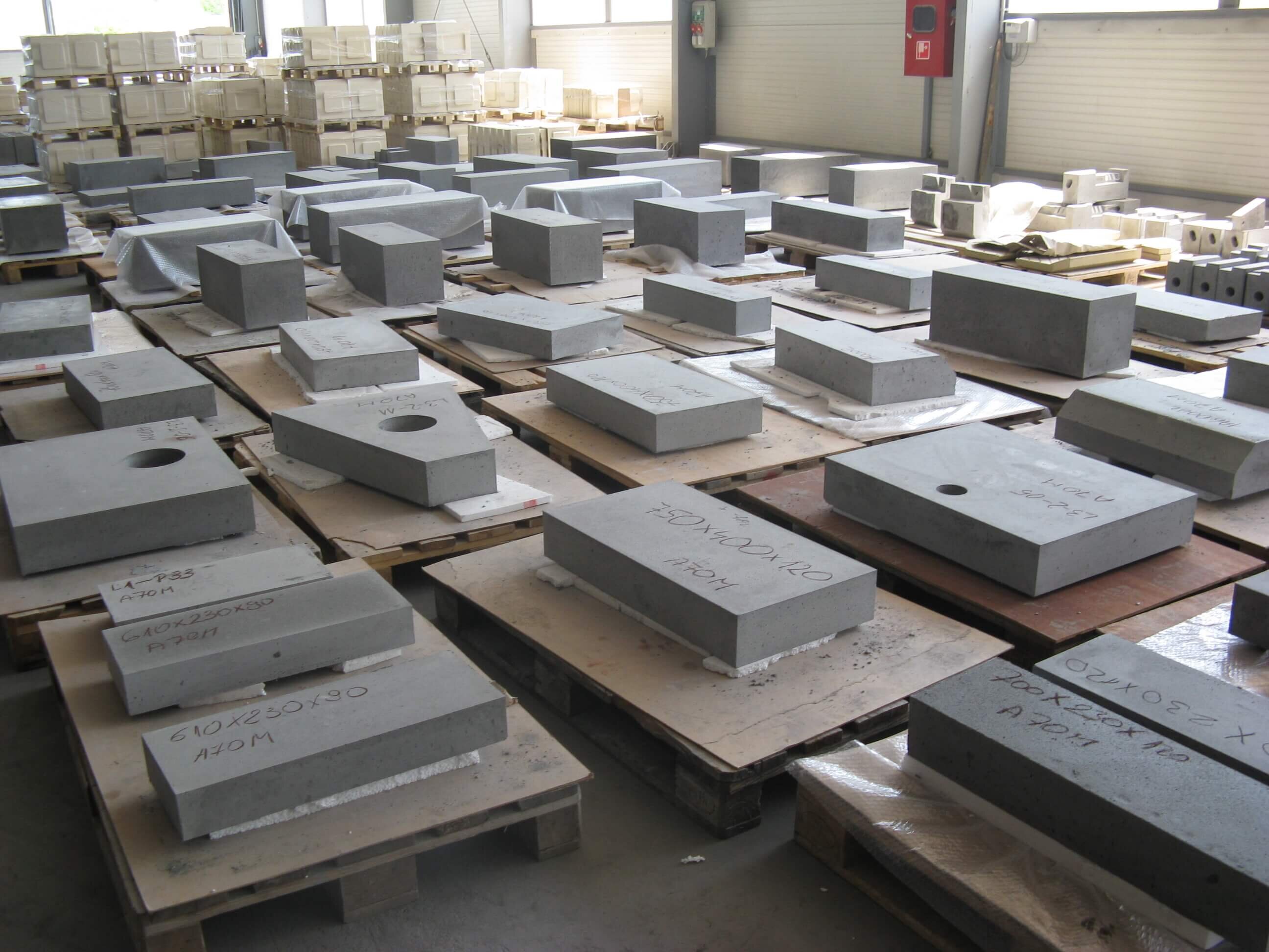 Dense stones and concrete moldings are fired at high temperature. The individual parts are - depending on their position in the oven or in the forehearth - processed and pre-assembled as needed.