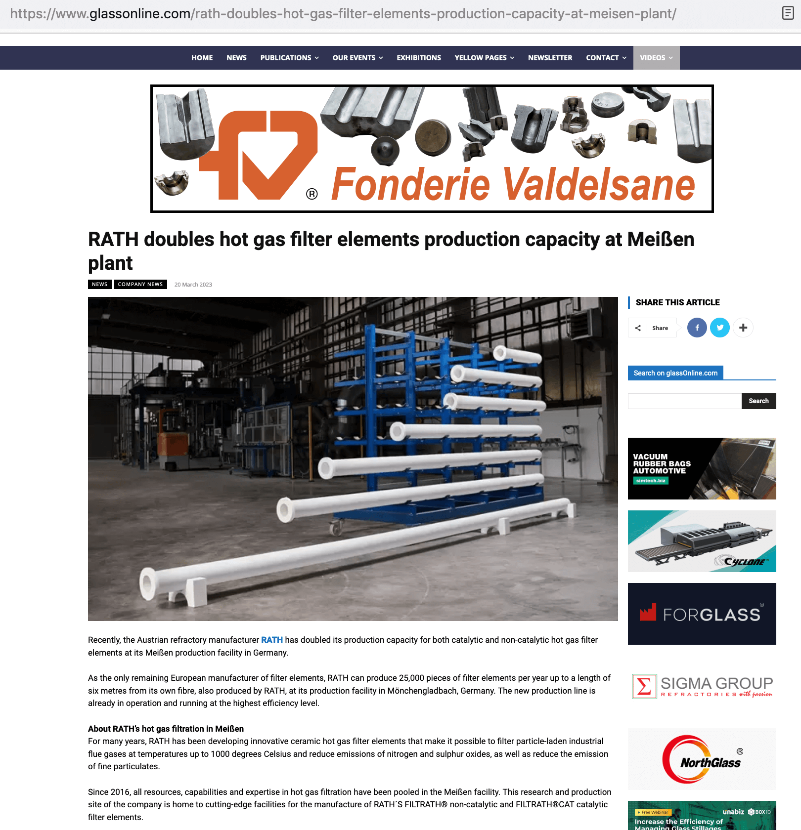 Glass online – Media report, March 2023 RATH doubles hot gas filter elements production capacity at Meißen plant