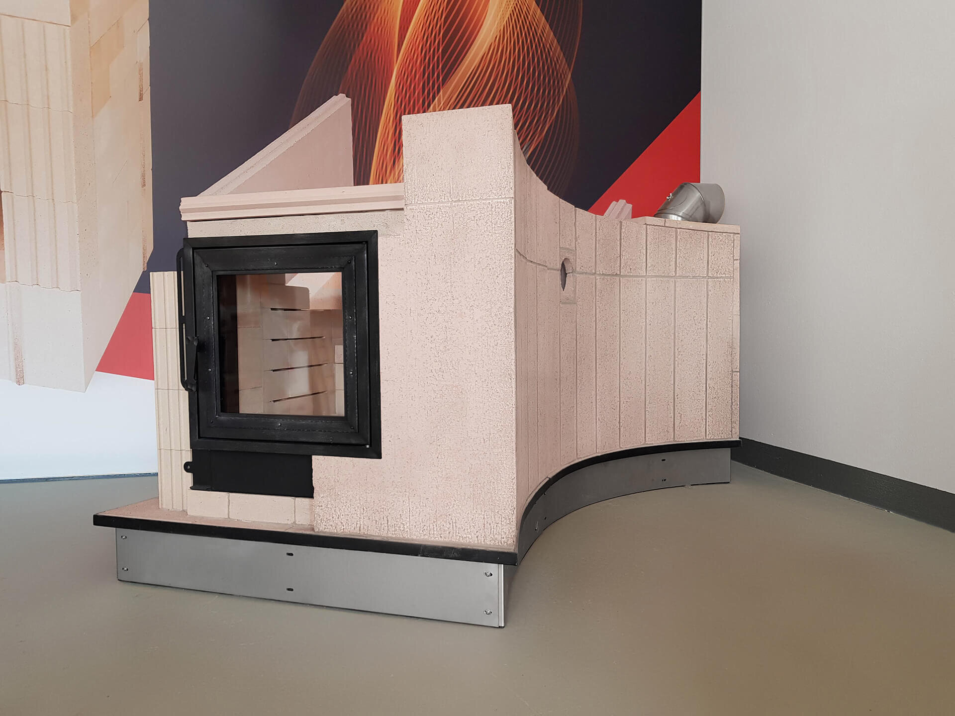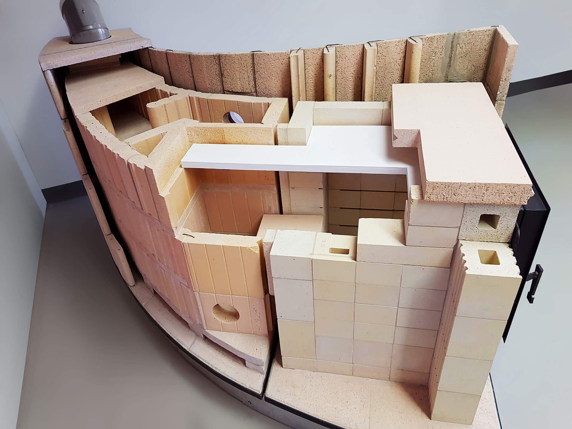 Weiters zu sehen bei diesem Ofen-Modell: Das angebaute Zugsystem aus 6 cm dicken Quickbrick- und Raupensteinen – mit letzteren können Rundungen optimal gestaltet werden. Mit den einander ergänzenden Formstein-Systemen Quickbrick und Raupenstein kann der Kachelofen-Innenausbau komplett ausgeführt werden. Zuguterletzt wird mit dem Ofenmodell auch der Aufbau der Ofenhülle gezeigt, die aus Schamotteplatten und Raupenhüllensteinen besteht; zweitere sind ganz leicht abgerundet und damit optimal geeignet für eine runde Formgebung von Öfen.